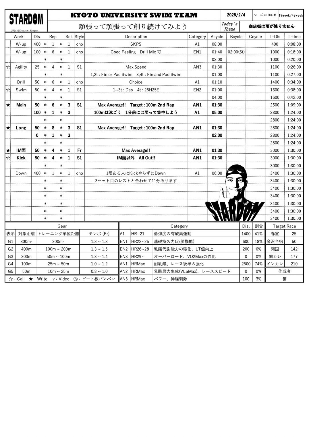 今日は久々のGSでした。皆さんいかがだったでしょうか。僕は死ぬほどきつかったです。病み上がりということも十二分にあったと思いますがヤバかったです。これ11月くらいからずっとなんですが、GSをやると2セット目の後半あたりからすごい吐き気と倒れそうな感覚に襲われて、泳ぎ切るだけで精一杯になってしまいます。正直、まだGSの目標タイムを目指す土俵にも立てていません。しんどいやら情けないやらでどうにかしたいです。