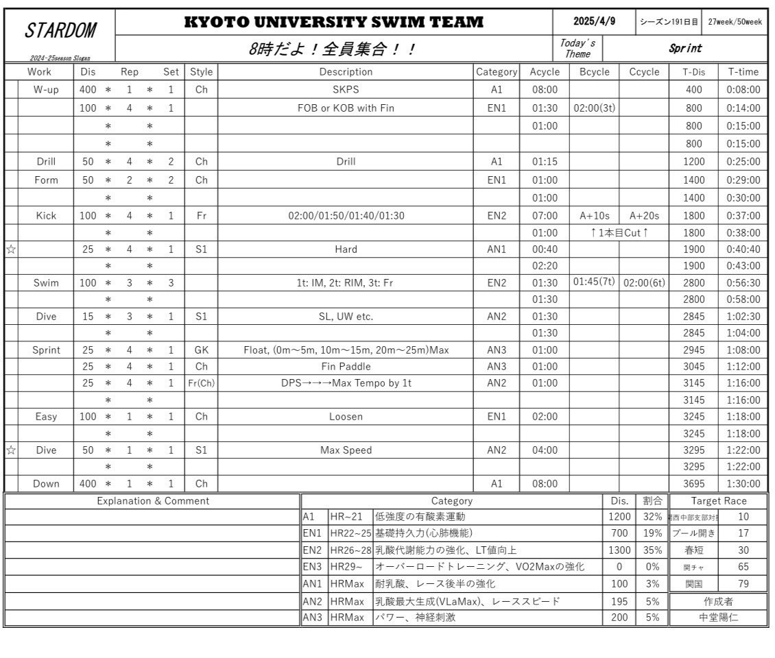 私は週オフを利用したため参加していないですが、メニューを見るにスプリント力強化といった練習でしょうか。