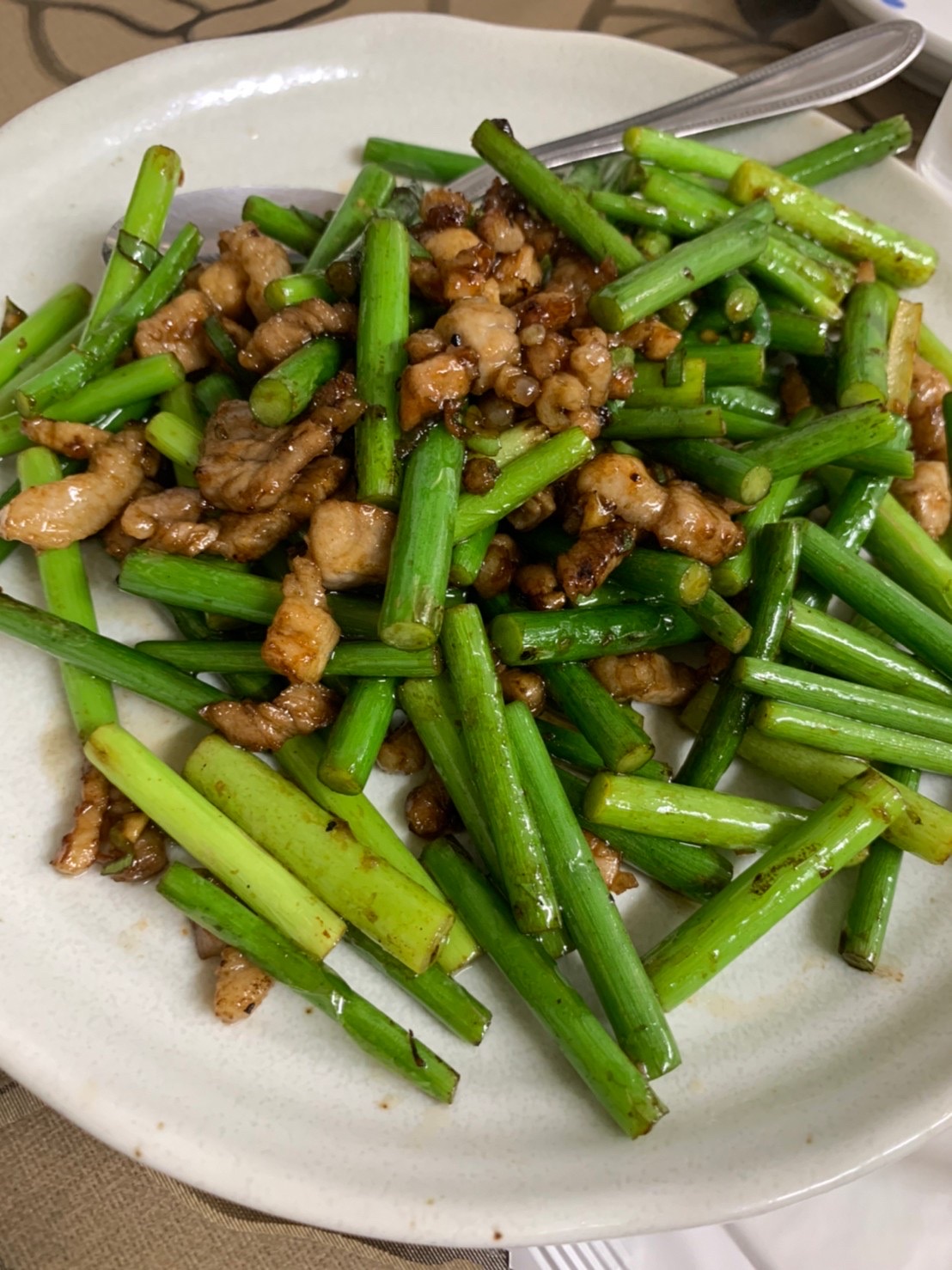 ニンニクの芽いためです。ニンニクの芽なんて、取り除くことはあっても食べることはなかったので、どんな味なのか心配でした。シャキッて感じの食感で美味しかったです。ニンニク特有の匂いとか辛みもなくて、ニンニクが苦手な人でも食べられると思います。