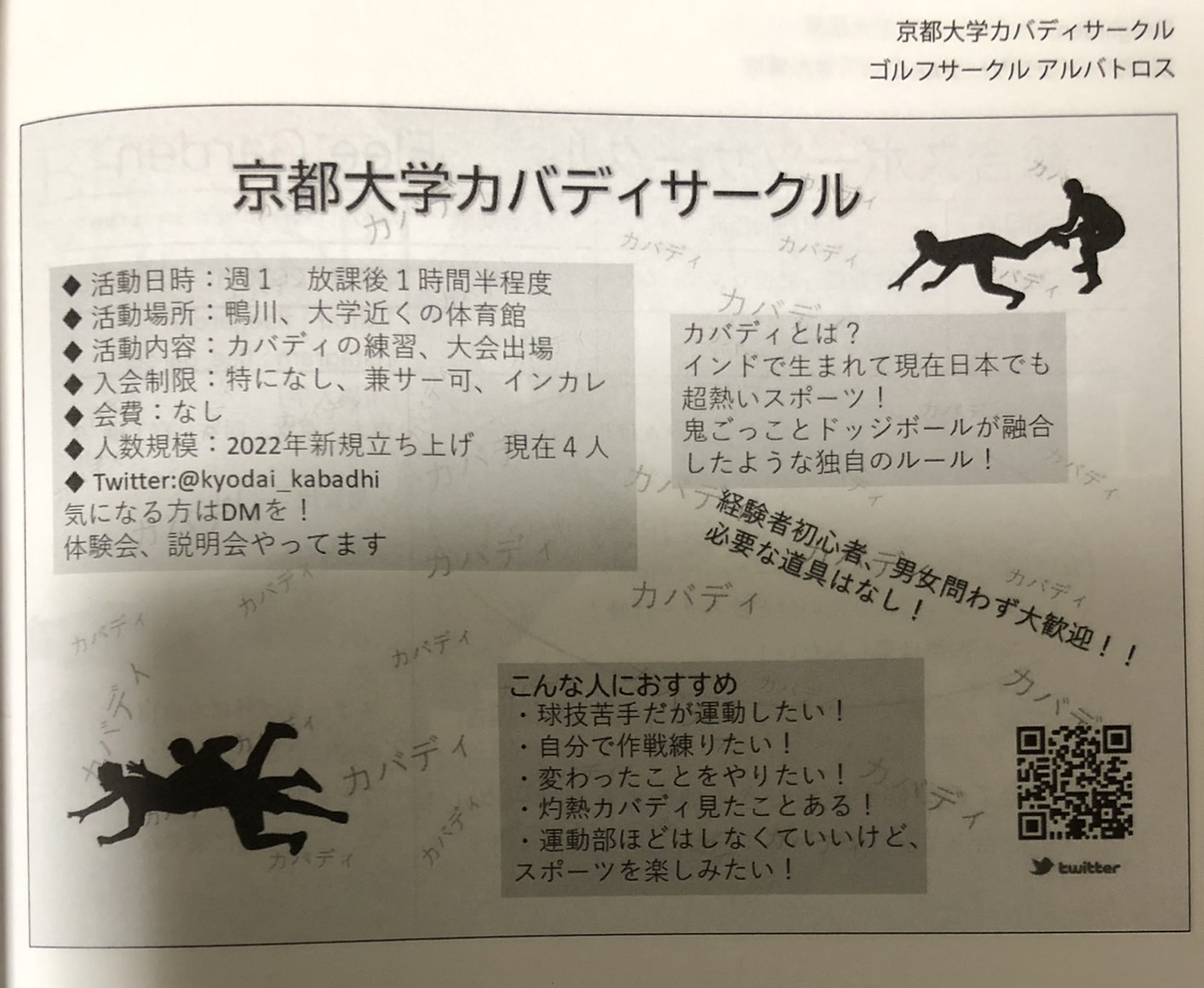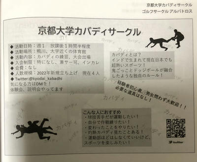 の三択で悩んでいたのですが、やったね袋に入っていたサークル大百科にカバディサークルがなかったので水泳関係のどちらかに入ろうと決めてました。