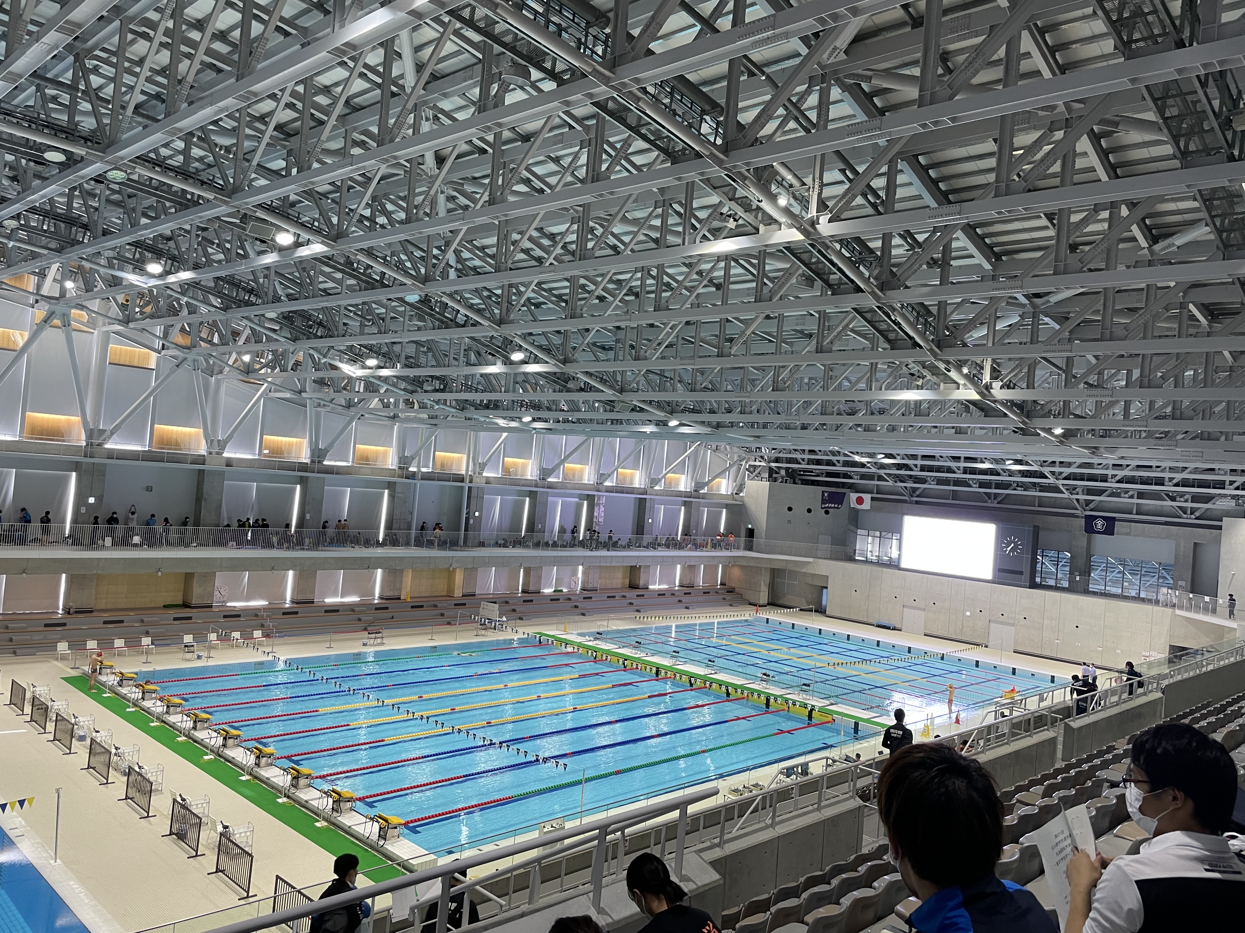綺麗し泳ぎやすい。写真真ん中がメインプール、奥がサブ?で長水だと多分ここがくっつきます。そして手前に見切れてるのが飛び込みプールです。電光掲示板の裏の所にもプールありました。