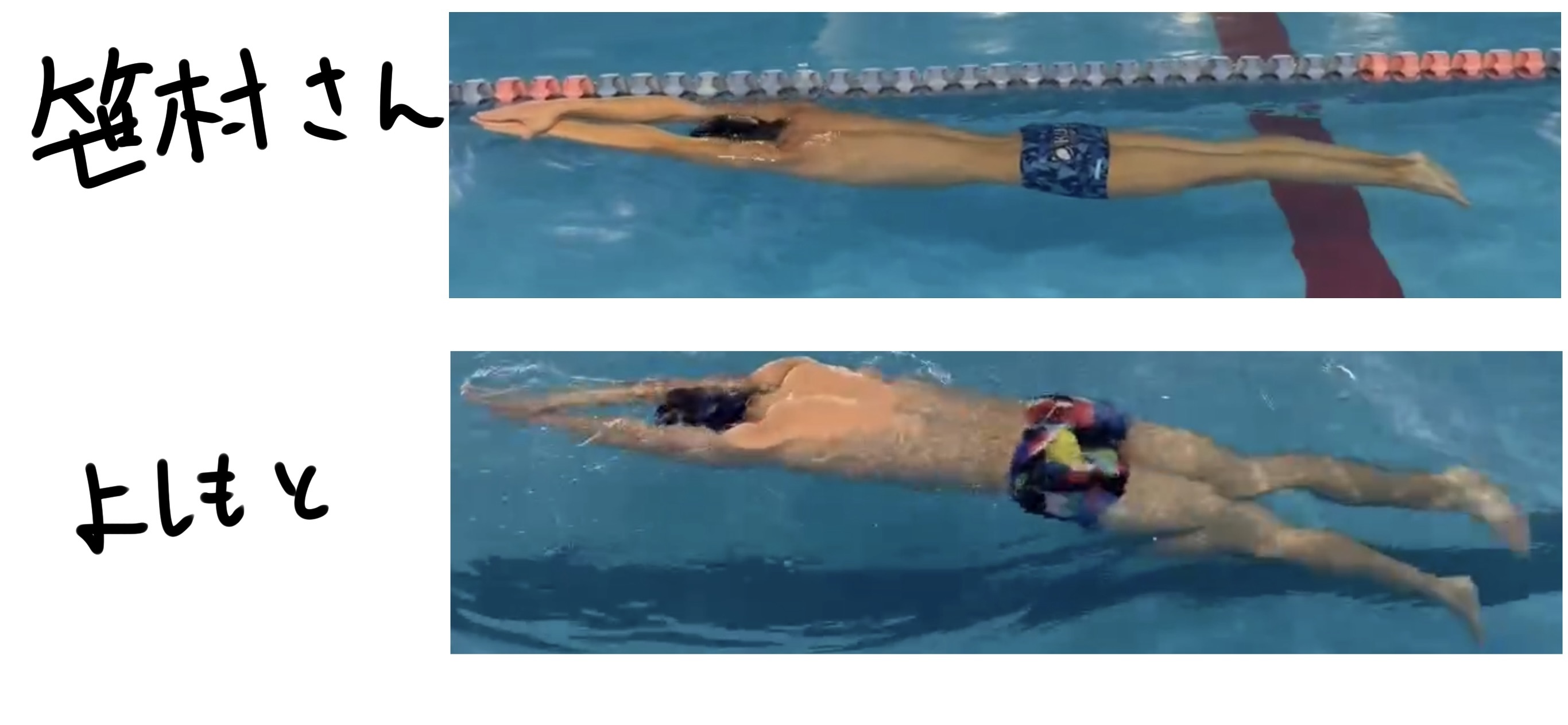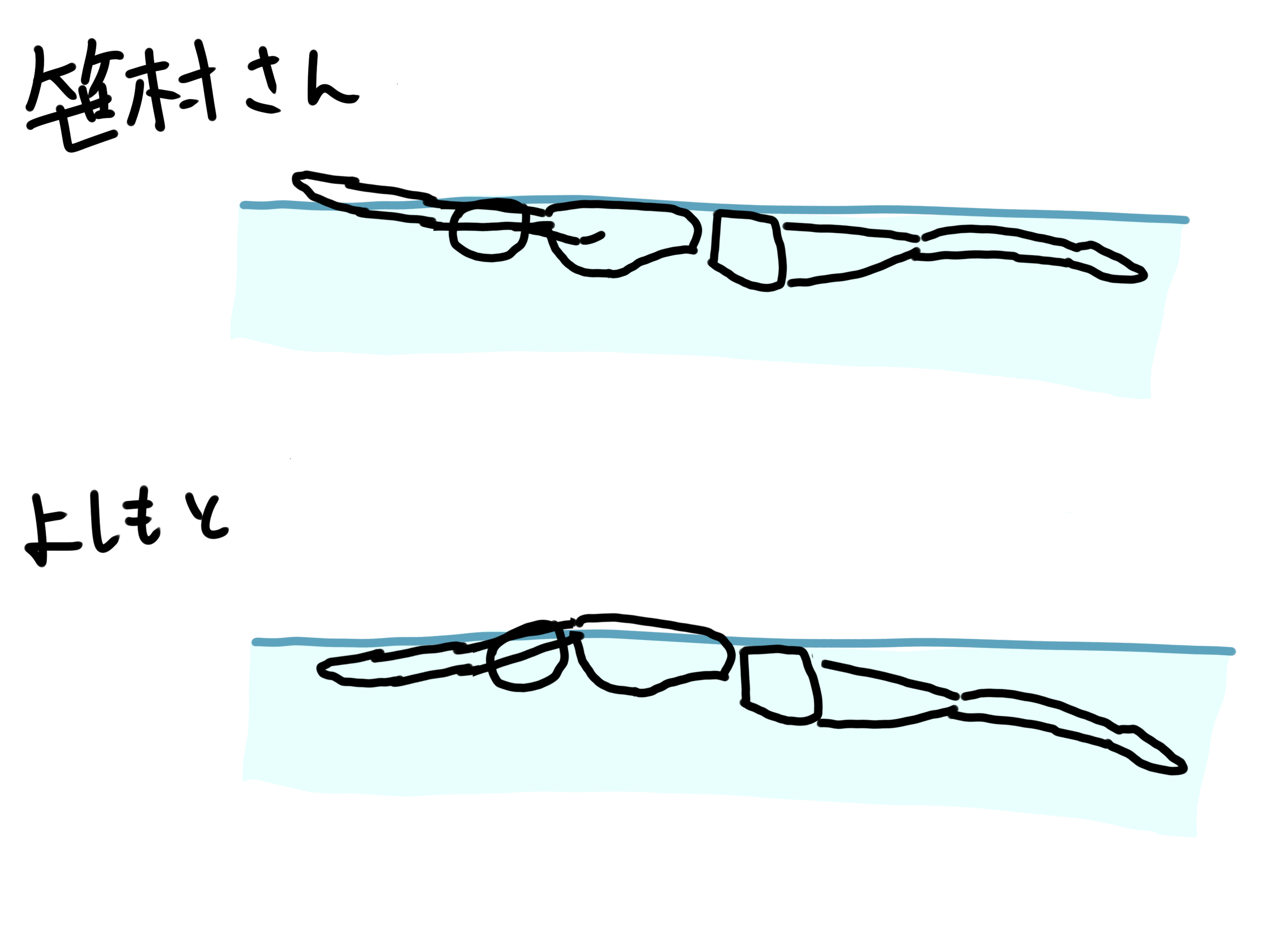 グループにあげられている笹村さんの伏し浮き動画と自分のを見比べてみると、水面から出ている部分が明らかに違いました。 図1 蹴伸びの最後の状態 笹村さんは3/6、よしもとは3/7撮影の動画