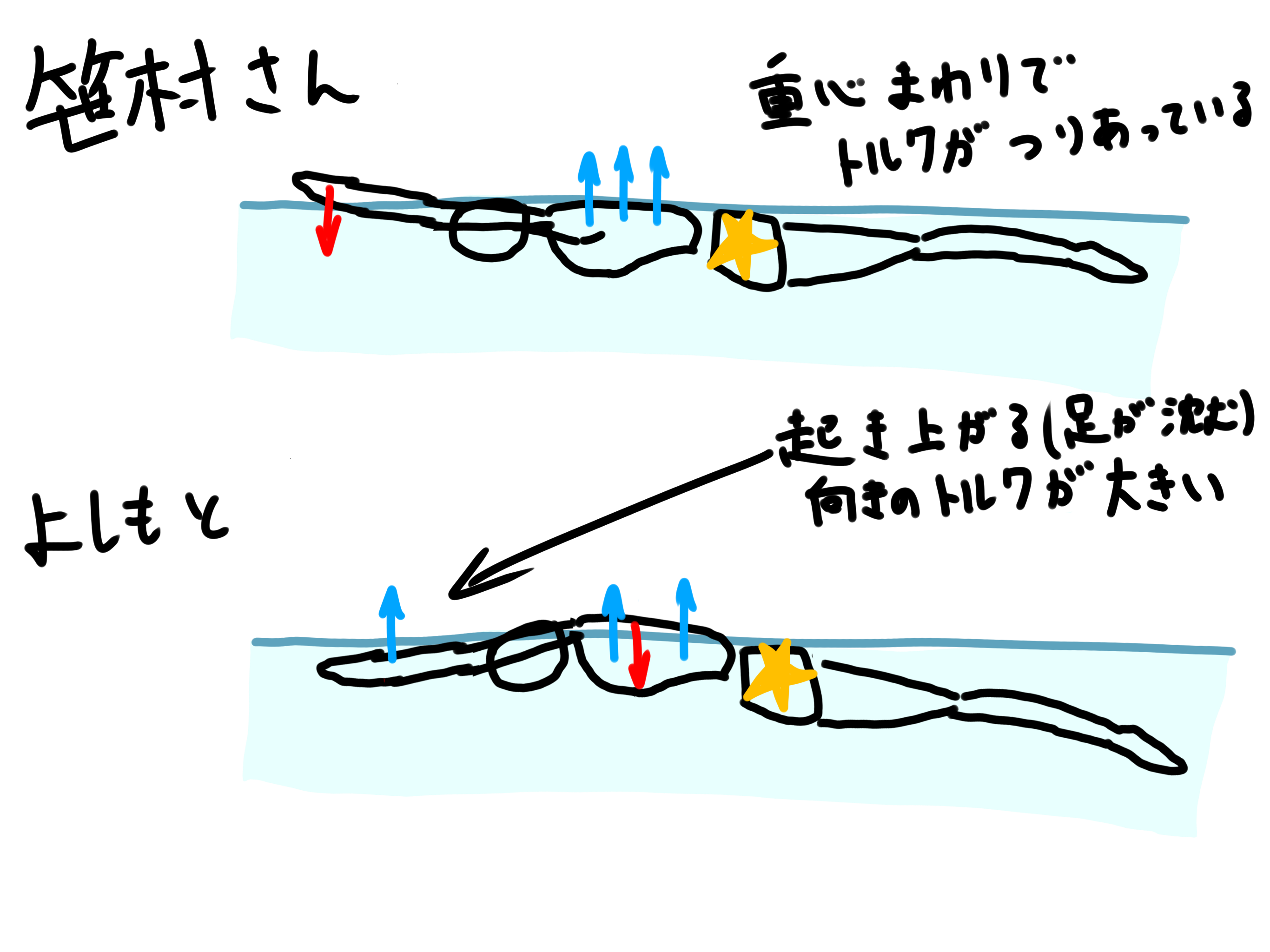 手が浮いていて肺の部分が沈んでいる笹村さんの姿勢が釣り合いの位置ならば、それと比較して自分の肺は浮いていて手は沈んでいるので、明らかに足が沈む向きのモーメントが大きいです。