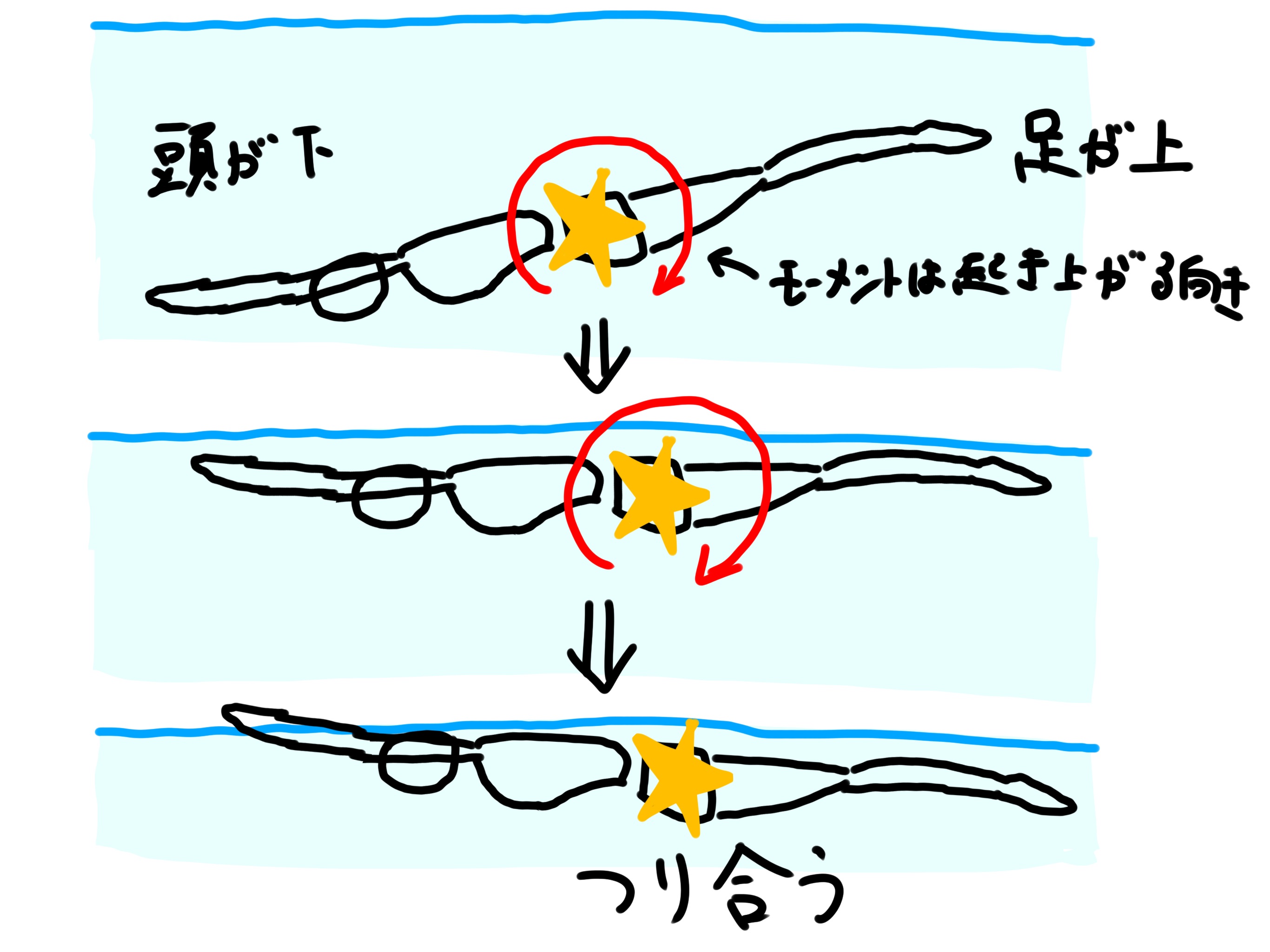 だから、水中では手が浮く(足が沈む)向きにモーメントがかかるけれども、ちょうどいい感じに水面に出るときには体がまっすぐになっています。