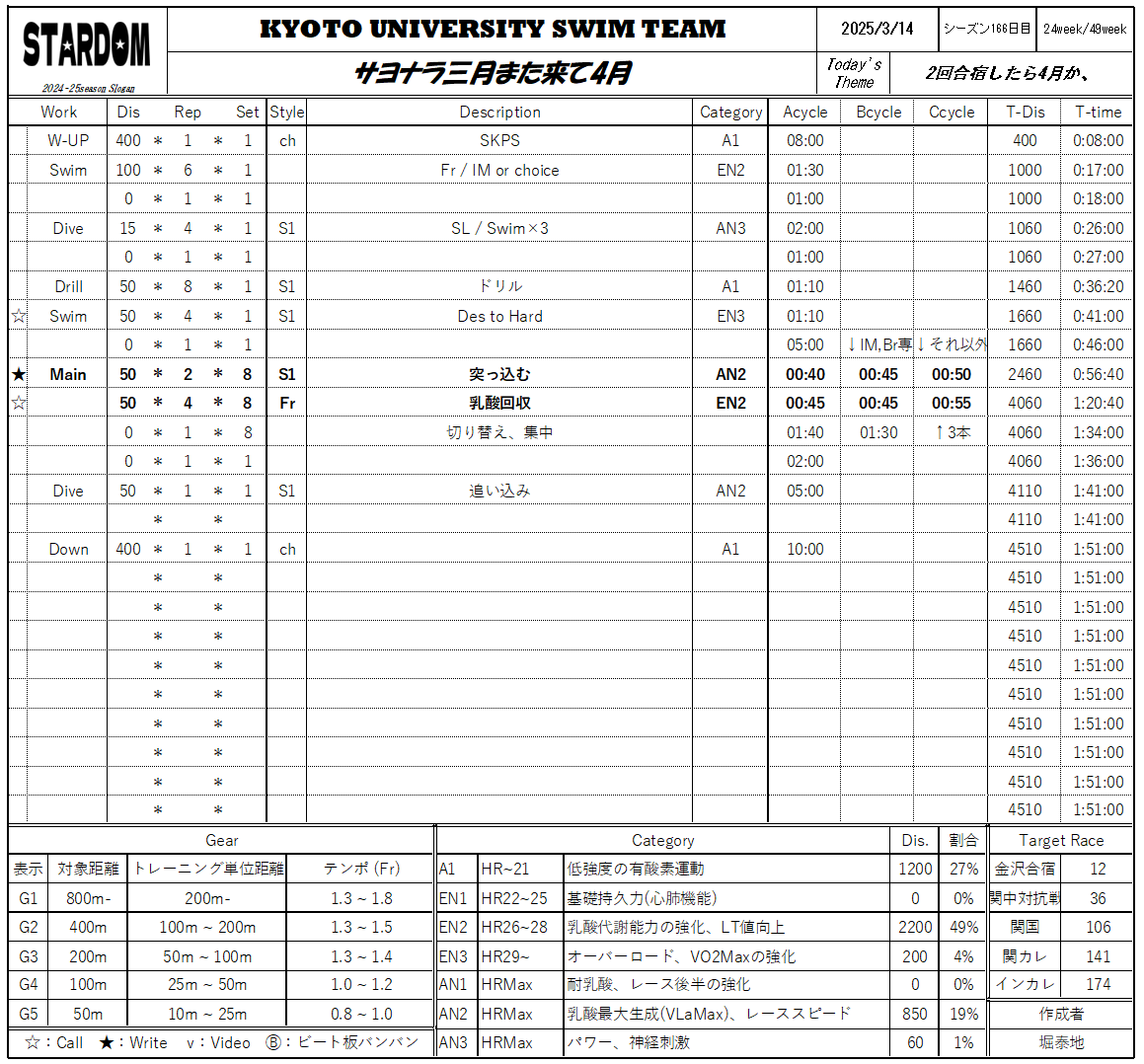 前半チキって後半しっかり耐えてラスト上げるという想定だったのですが後半以降前半の泳ぎが帰ってくることはありませんでした。1:14で入って1:28で帰ってますね、、、