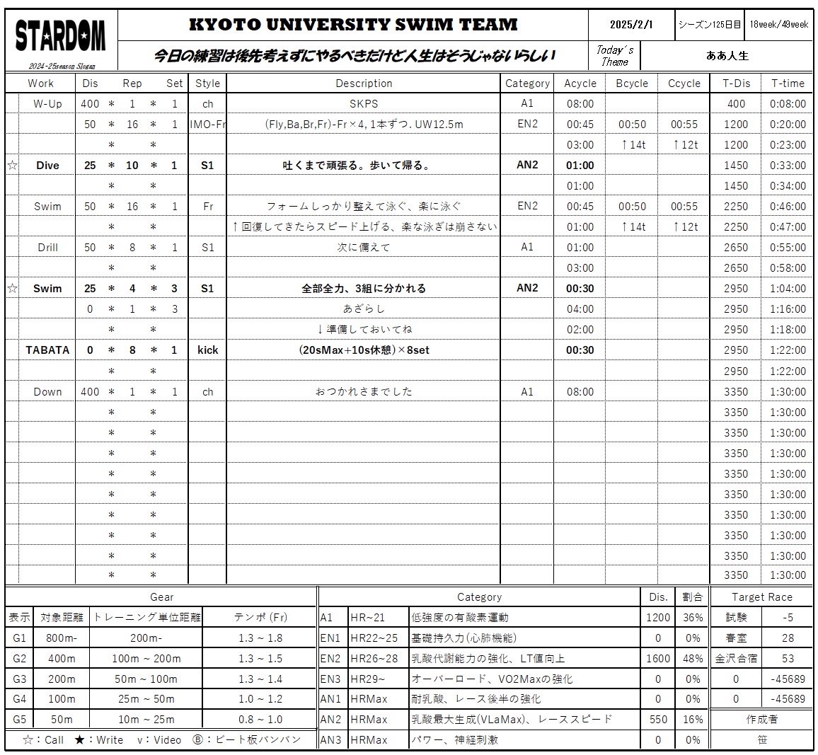 ラップは最初のバッタだけ良くて他はバテるっていう感じやったんで、月木とかのメニューちゃんとこなして春短か夏季公くらいで再チャレンジしたいと思います。