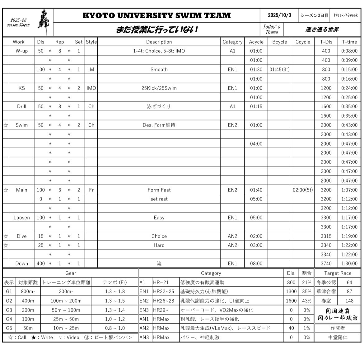 おつかれさまです。今シーズン女子主将を務めさせていただきます、清川です。これを読んでくださっている水泳部関係者の方々、日頃から支えてくださるOBOGの皆様、今シーズンもどうぞよろしくお願いいたします。ゆうごや中堂と違い、今まで幹部職にはいなかったので、初めましての方も多いかもしれません。お見知りおきいただければ幸いです。本日は金曜Mainでした。メニューです!!