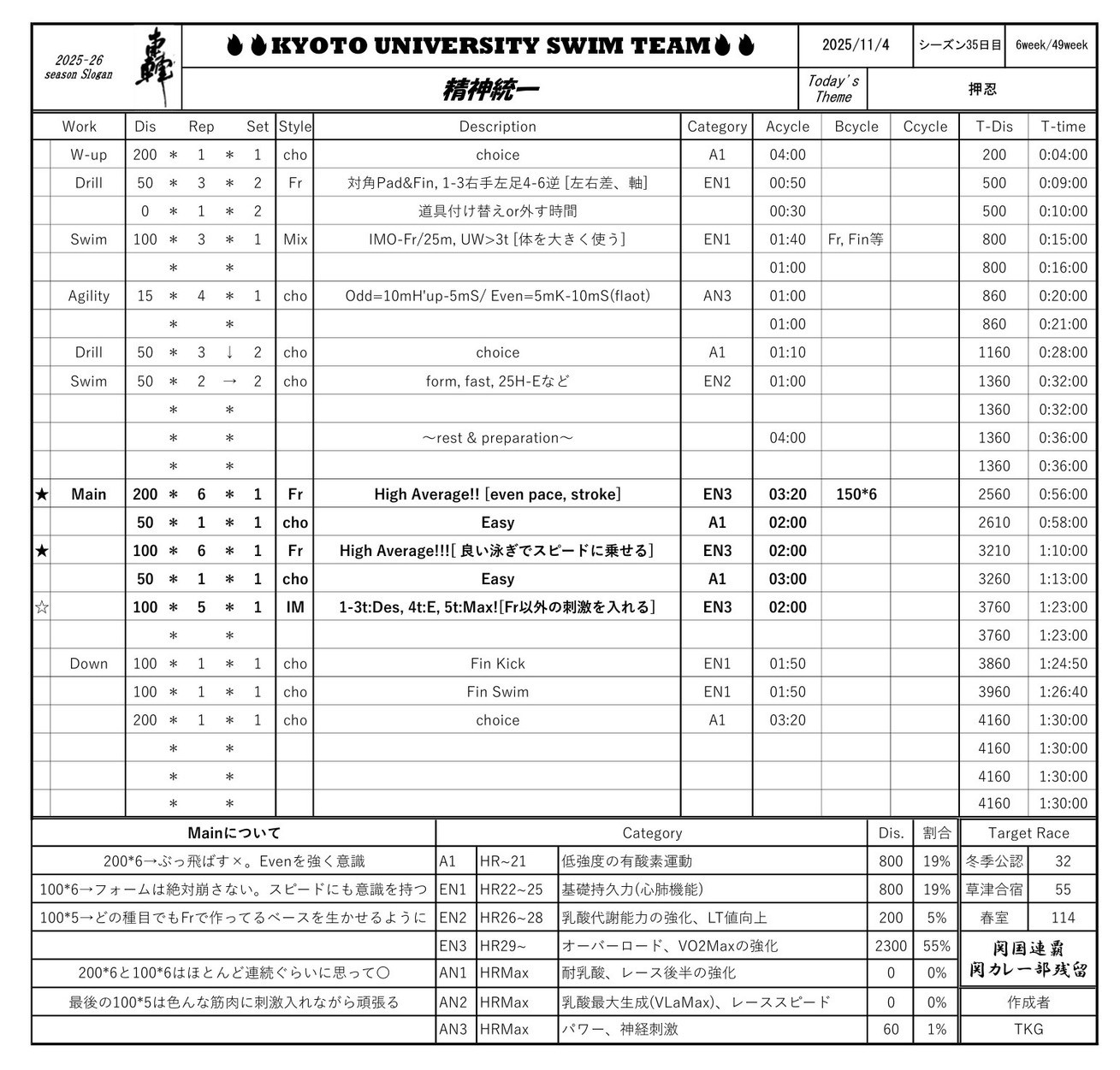 2ブレは特に短水の方が切りやすそうなので冬の間に切りたいです。もちろんリレーも頑張ります。メリレは、引き継ぎ1’01くらい出せたら切れそうです。28.5-32.5なら1’01いけます。4K、8Kはそもそもレギュラーになれるかまだ分かりません。最近は基礎鍛練期ということでFrのKickやSwimのENの練習が多く、Frの泳力が少しついたように感じます。関国OBOGでも1フリ52.2、2フリ1’56出せましたし。4K、8Kもメンバー入りを目指したいです。もちろんこんなタイムで満足してはいられません。もしフリーリレーを泳ぐことになればフリー専と同じくらいで泳げないと足を引っ張ってしまうので。