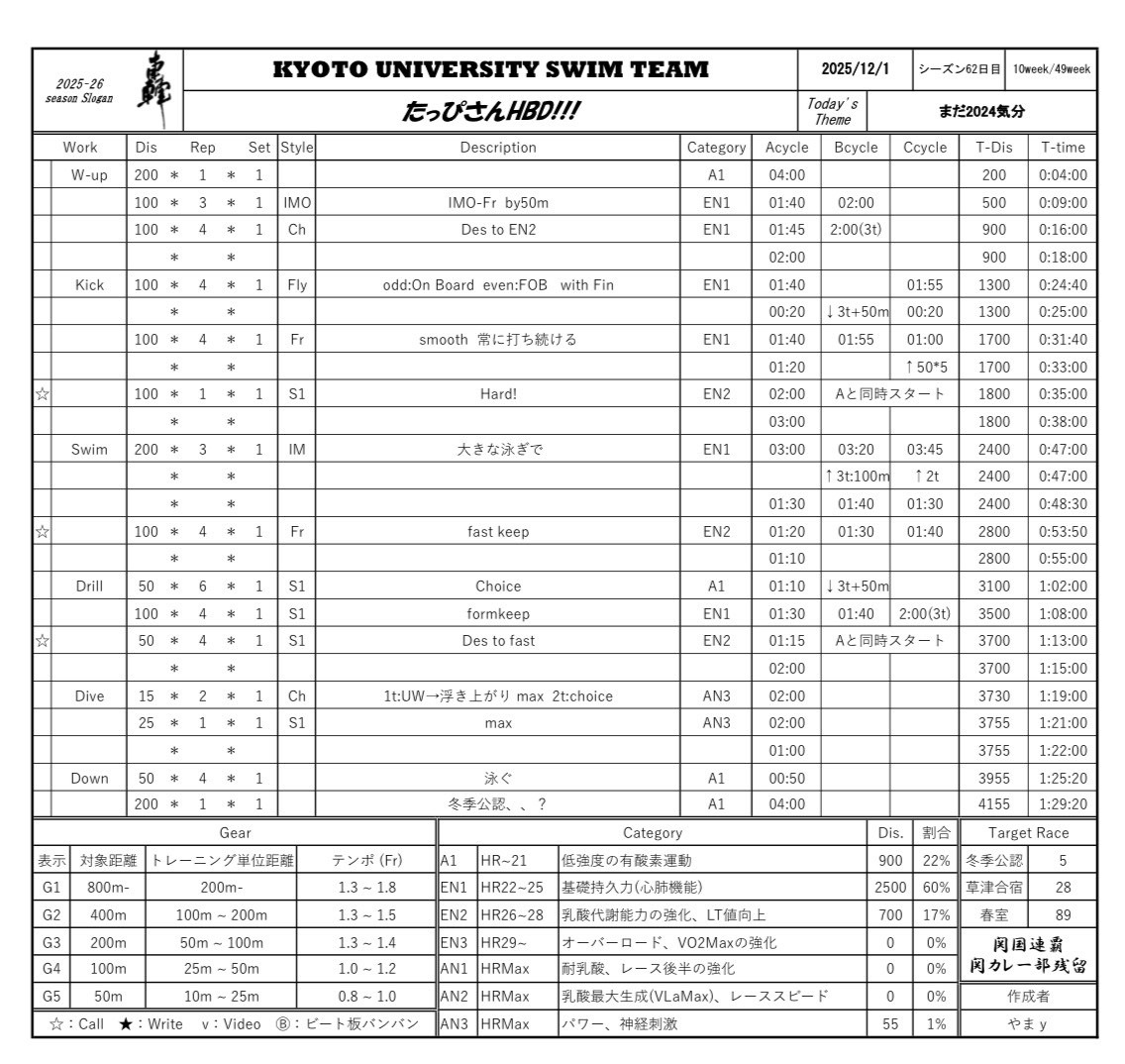 正直昨日あまり寝てなかったので、タイムとる時不安でしたがなんとかプラマイ5忘れずに耐えました。最近練習参加率が高くて、すこしだけ5時45分起床が身に染み付いてきた気がします。