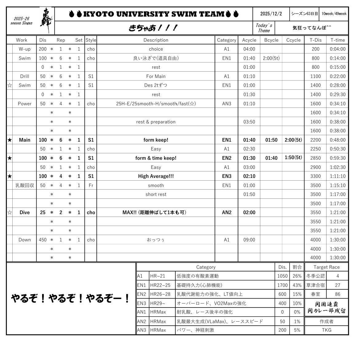 今週末には冬季公認があります。久しぶりの大会です。しかも短水です。楽しみです。ですが専門鍛練期は始まったばかりです。何秒で泳げるか皆目見当がつきません。1ブレは引き継ぎ1’01を目指します。2ブレは2’15を目指します。最近はENばかりやっていたので100より200の方が自信があります。フリーは基礎鍛練期に結構泳ぎ込んだので引き継ぎベストを出したいです。ばた足サイクルインとタバタバタバタの効果が出ればいいなと思います。