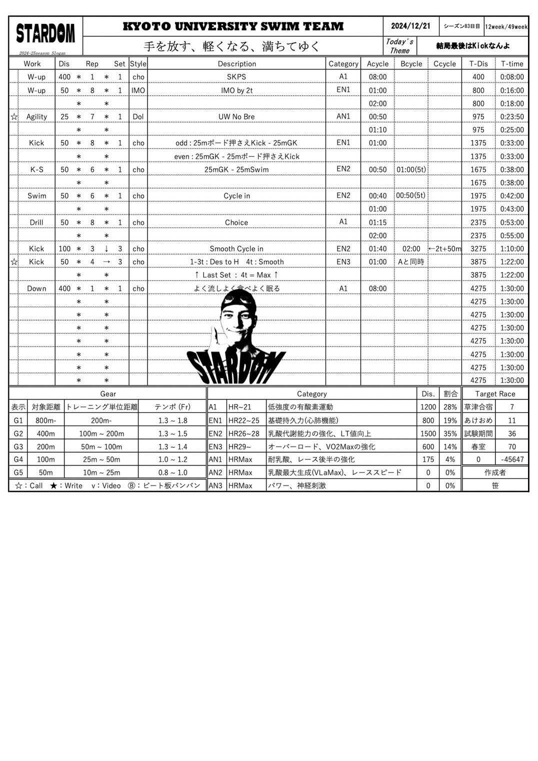 Kick自体は推進力になってないみたいな論文を筑波大かどっかが出してましたけど、Pullのテンポキープしたり腰浮かしたりするうえで不可欠やなって上から見るようになって一層感じます。