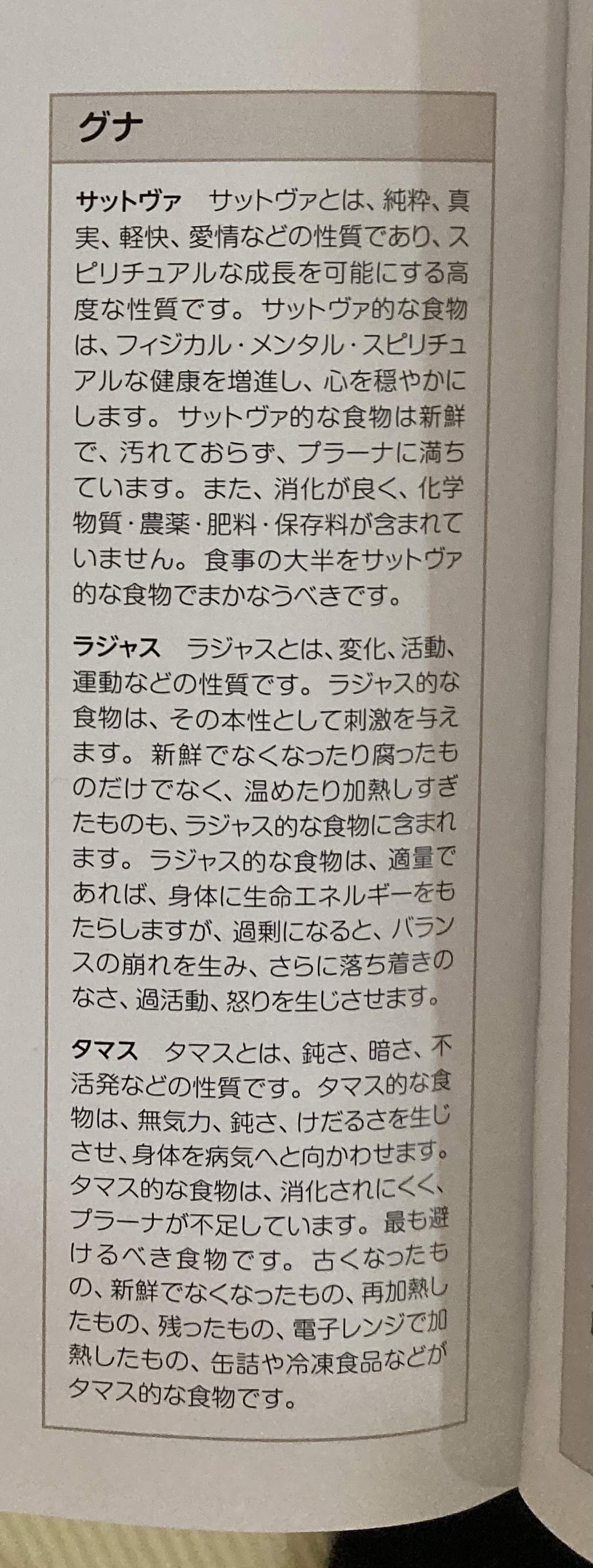 簡単に言うたら、ラジャスはほどほどにサットヴァ食っとけよ、タマスは食ったらあかんぞ、って感じです。