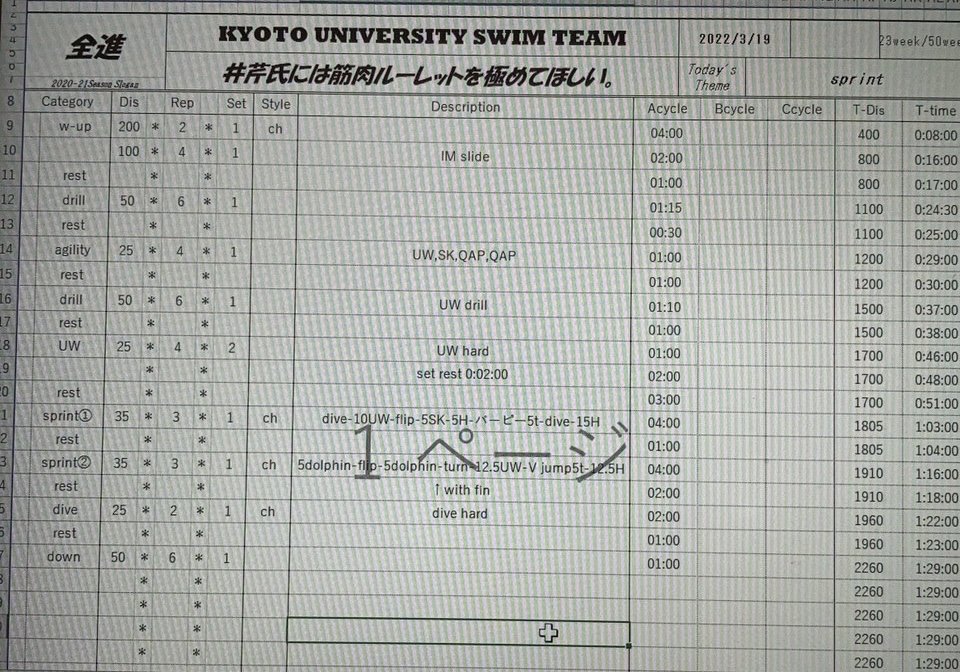 夜練ということもあってか今週の中では体動きました。1回の距離が少ないのと3本ずつの二本立てだったので集中できたし、フィン付きのスプリントメニューでスピード出す感覚思い出せたので良かったです。