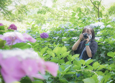 あじさい畑の中カメラを構える来未。紫陽花の前ボケがポイントです。2021.06.19 @真如堂