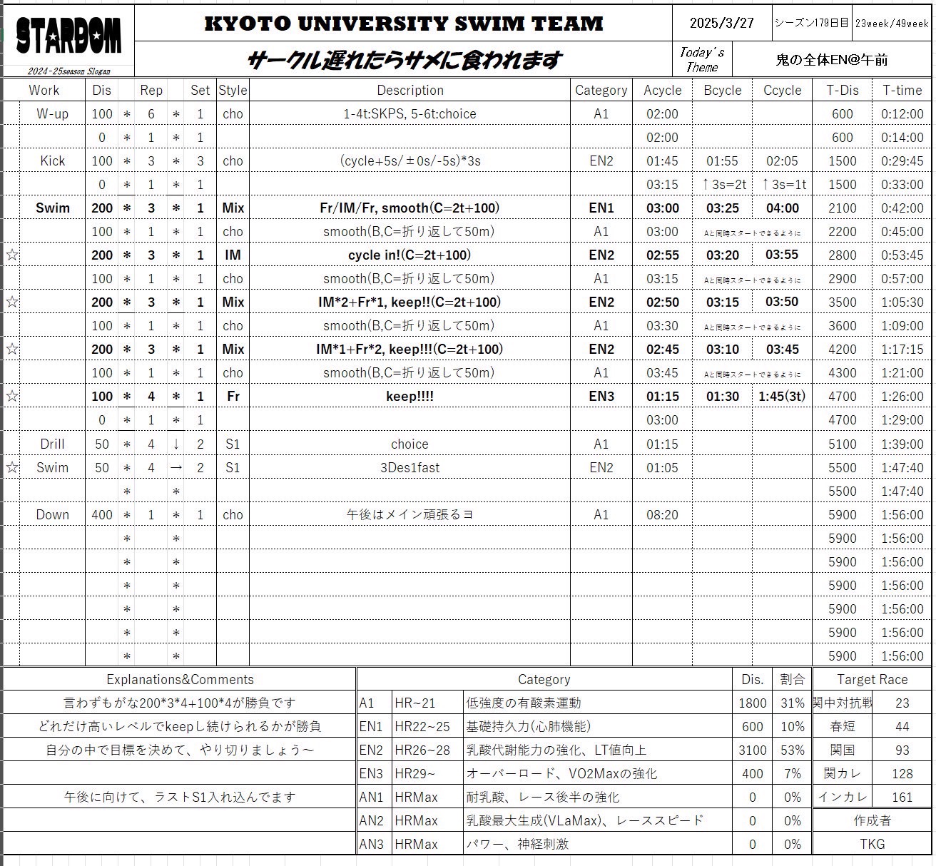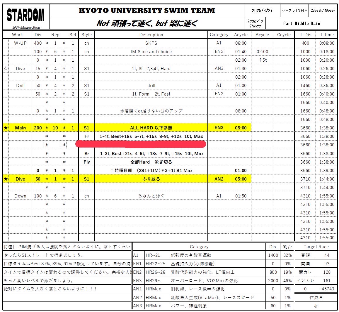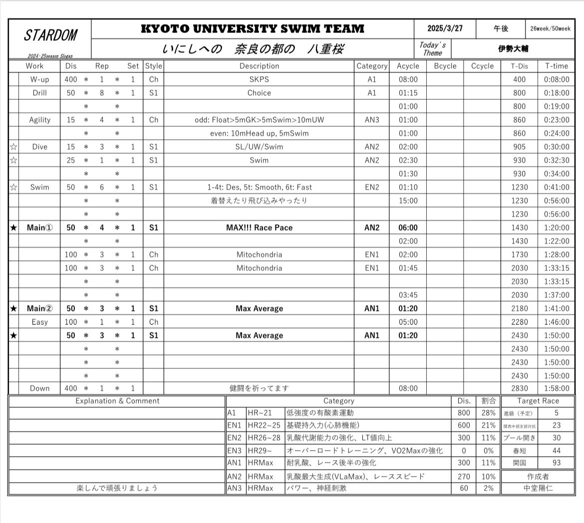 合宿2日目って感じのメニューでいいですねぇ。特に午後のミドロンのメニューは今回の合宿の中でも精神的にキツそうでした。
