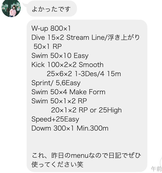 福田さんが作成したメニューで、50mと25mを2セットずつ泳ぐ内容でした。