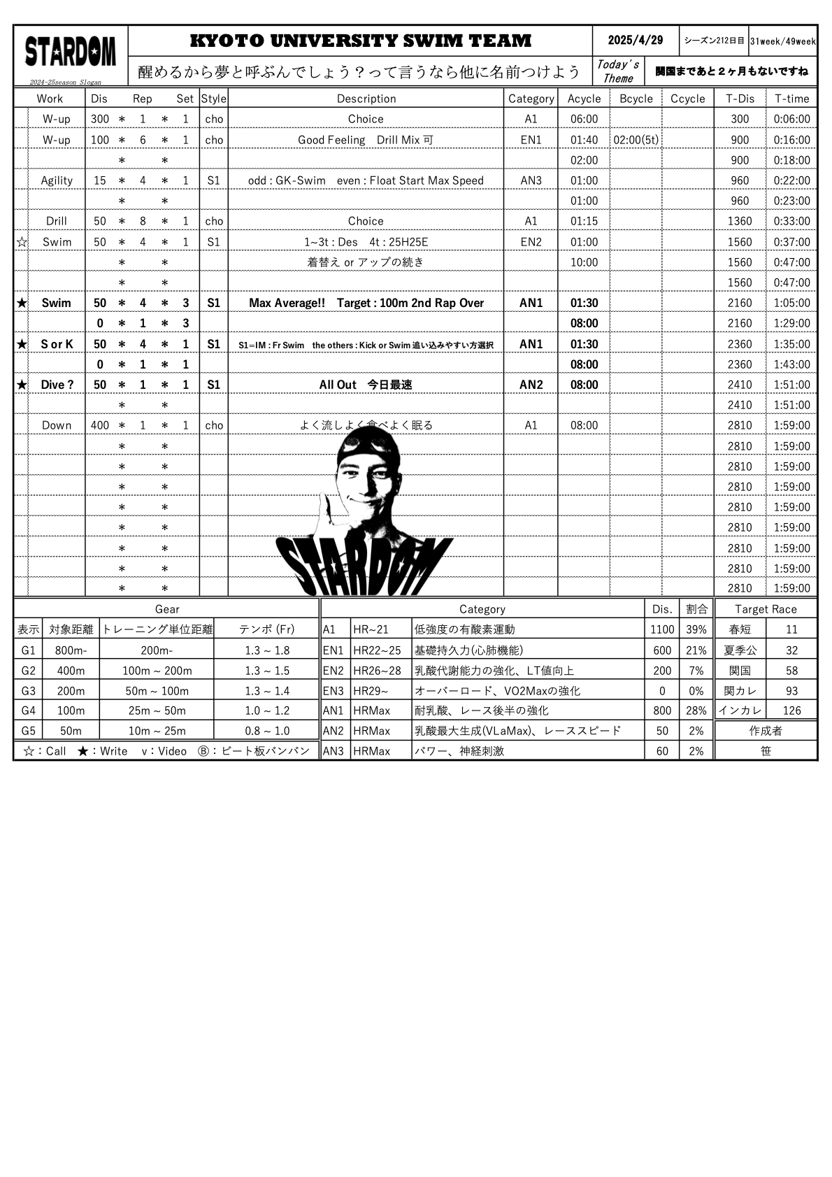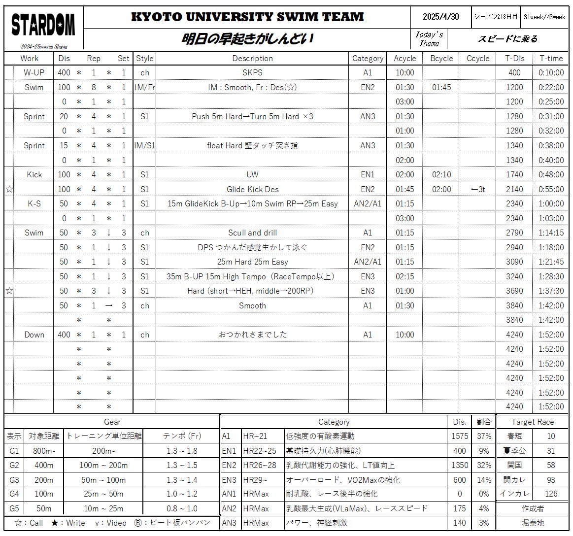 ちょい長めのENとメインは普段よりちょい速めの泳速を短めかつ少しずつ増えるサークルで頑張ってキープしようメニューでした。