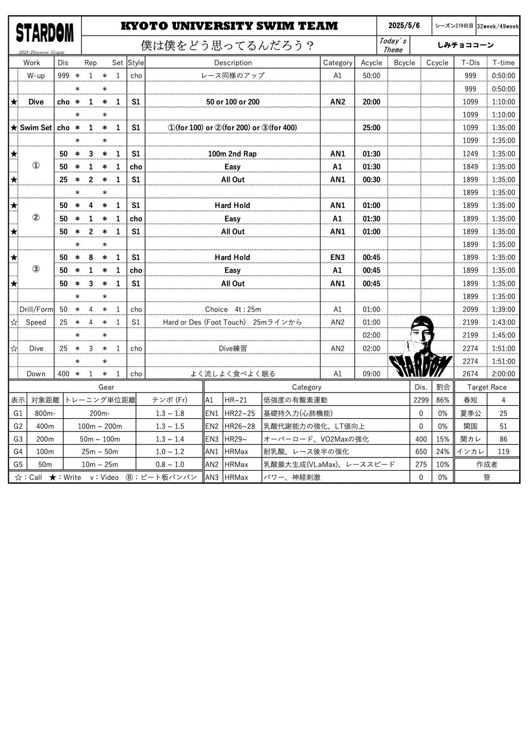 肩をよく痛めるので、昨日から肩トレを始めたのですがそれのおかげで今日はいつもより腕が重く、半バック30割ろうと思ってたのですが、腕が思うように回らず、割れませんでした。なので今週末の春短では短水路ですが、30を割りたいです。腹筋を使ってバサロができるようになってきて成長を感じます。