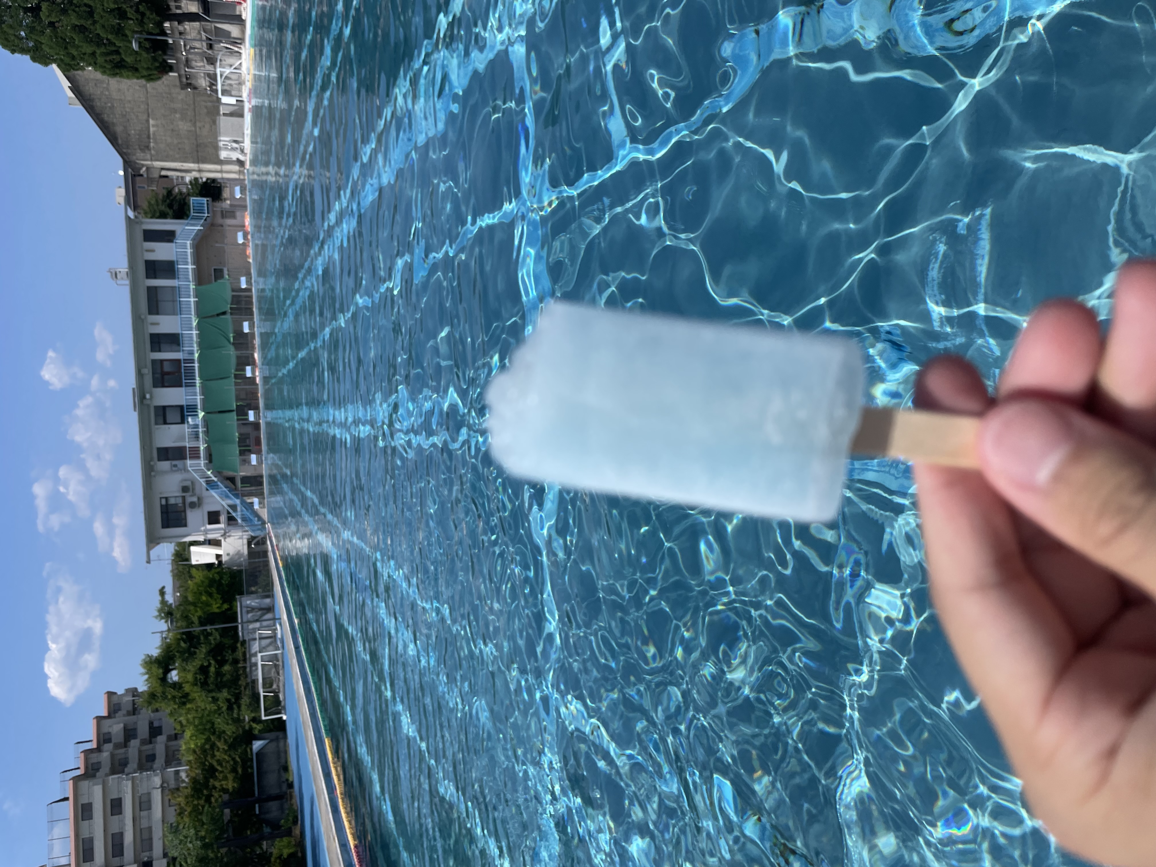 昼食を食べた後、京大プールに戻ってきてダラダラ喋ったり、夏全開!って主張が強すぎる太陽に照らされたプールサイドでアイスを食べたり、朝パで「今日のほうれん草下振れたw」とか、「今日の梅ちゃんの顔下振れやん笑」とか言ったりしてます。