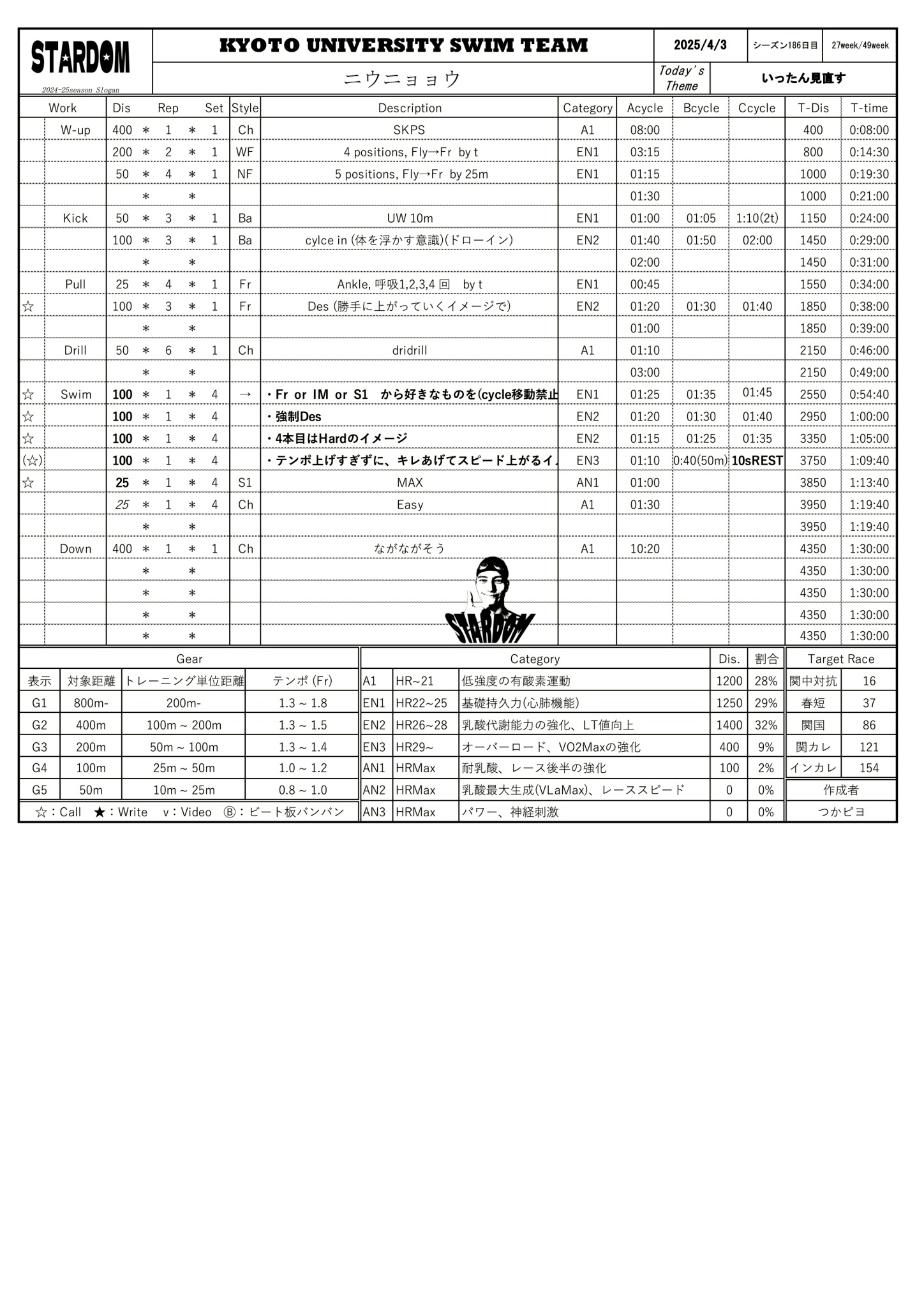 ・50m×2(S1:100m Best ÷2 + 0.5s以内)AN2 / 1:20 → 100m / 03:40