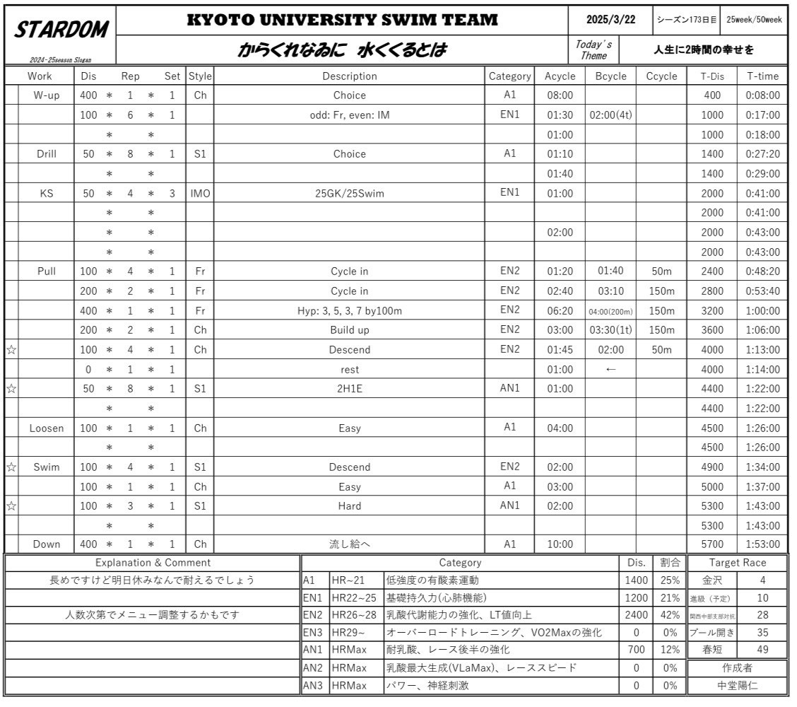 自分はRESTが長めで1本に全力を注ぐメニューが好きなんですが、こういったRESTの短い練習をこなしていくことで試合後半の体力増加にも繋がると思うので妥協せずに取り組みたいです。