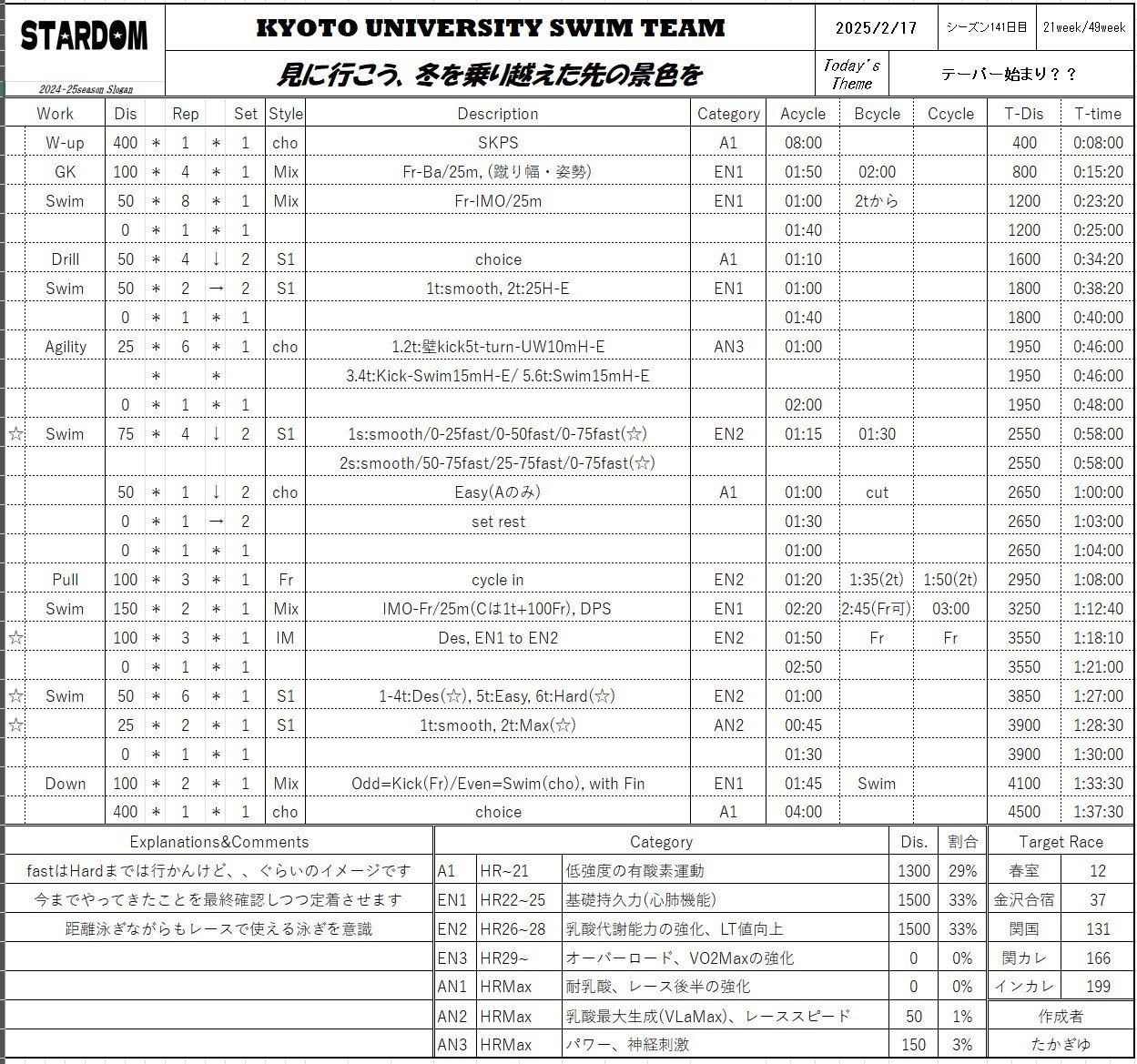 全体的にブレのタイムと感覚が良くなってきてます。最後のダイブは100やる羽目になりましたが、結構いいタイムが出たと思います。最近成長が実感できて嬉しい。