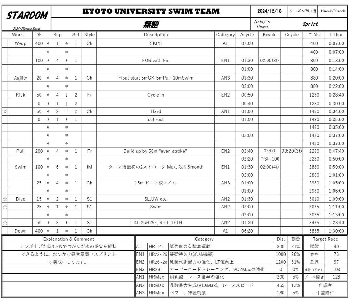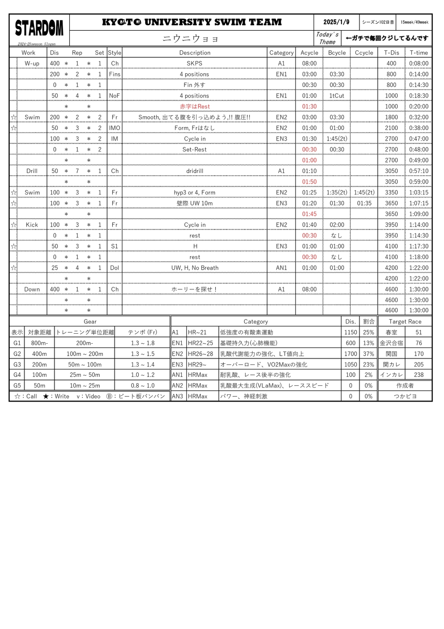 月火は体が重かったけど今日は結構体が動きました。Frのサイクルは結構ちゃんと回れるけどIMのバッタバックが遅すぎる。コソ練しよかな。