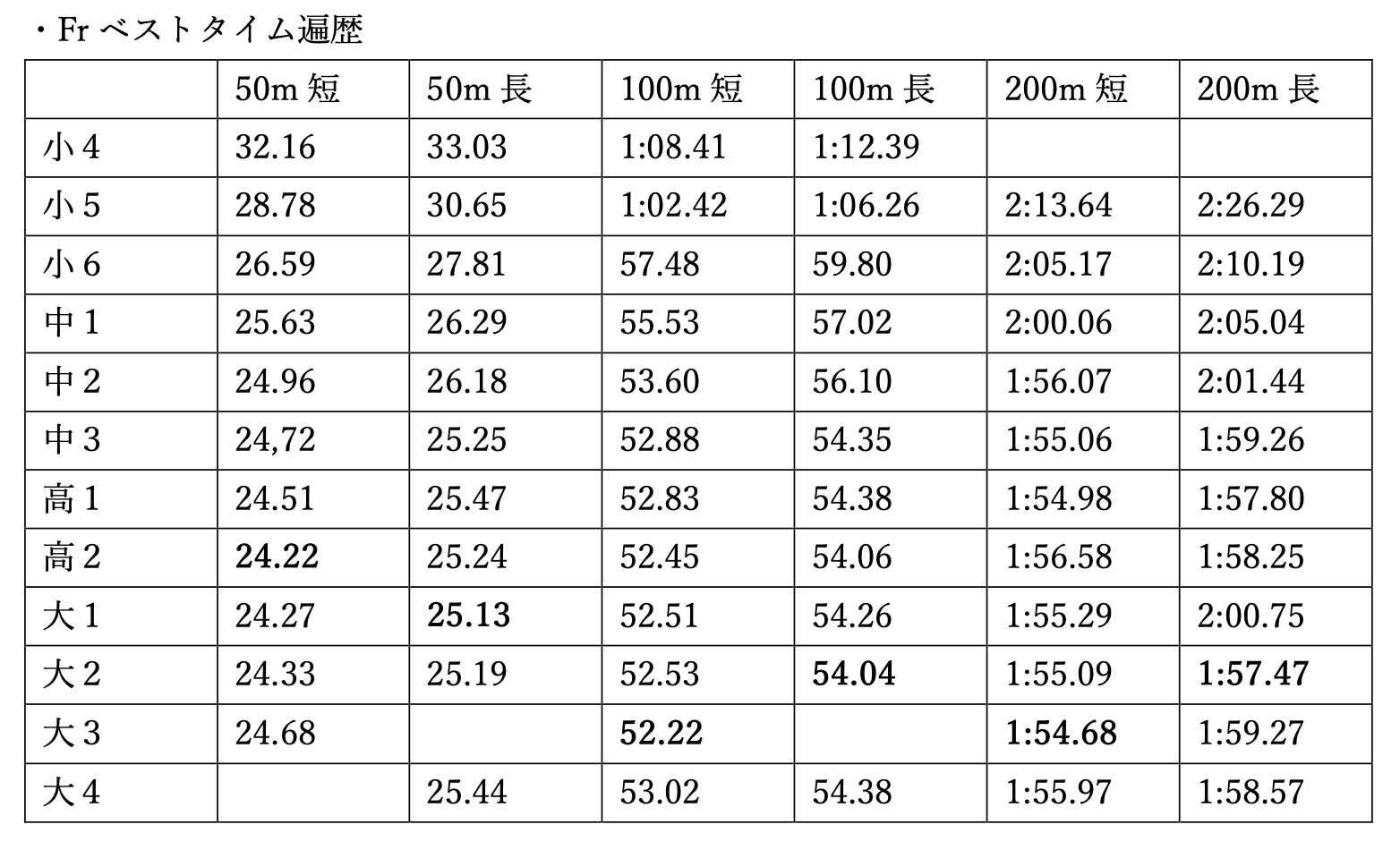 ルネサンスへ。この頃からFrに転向。県のジュニア強化合宿に参加し、周りと比べて平泳ぎが遅すぎることがついに発覚。膝崩オン泣。