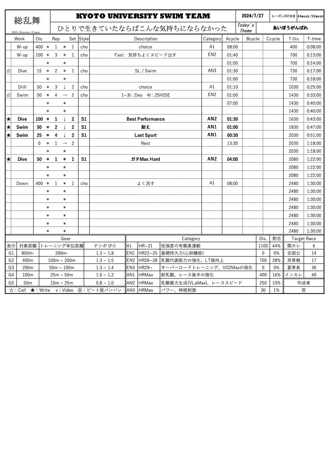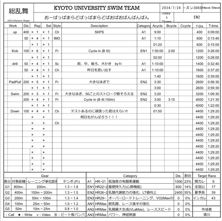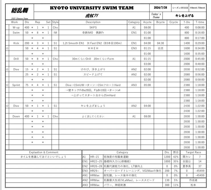 今、足らないと思った要素をちゃんと自分で補えていますか?全体でやることなので、個人全てに合わすことは難しいですし、メニューやドライも感覚、慣習でやってる部分もあると思います。だから全てが正しいものと思ってはいけません。1つ1つの内容にしっかり目を向け、それが正しいものか分からなければ、出題者に聞いてみましょう。与えられたものを脳死で消化するのではなく、自らの頭で根本から捉え直し、自分の手で栄光を掴み取りましょう。僕が作ってきたメニューでは、メニューの流れ、ENの時間、耐乳酸の単位距離、本数、運動時間:レスト比、メインの合計時間は全部に意味を込めて作っていました。