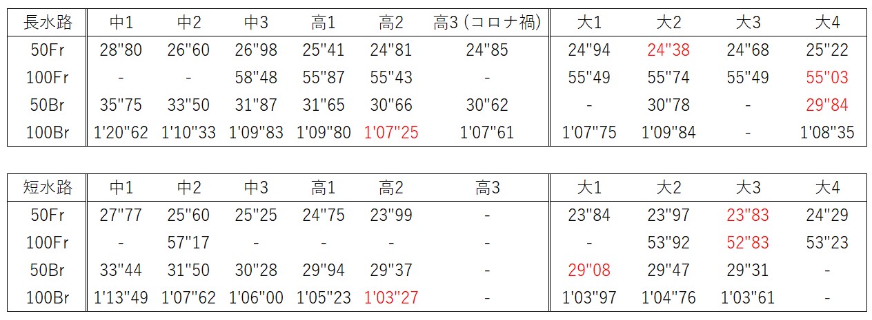 今までの競泳人生を振り返れば、中学からの年度ベストはこんな感じでした。赤字が生涯ベストです。