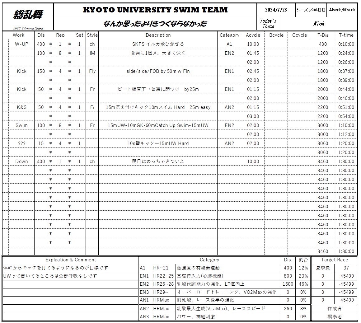 例えば、週5回、90分練習、このTotal距離で体力はつくのか、Drillは50*8本で足りるのか、W-upは400SKPSで体がちゃんと動くのか、ドライは練習前の10分だけで十分なのか、筋トレは週1回で良いのか。