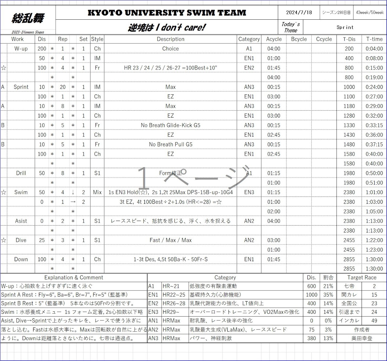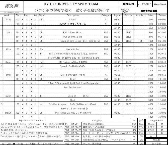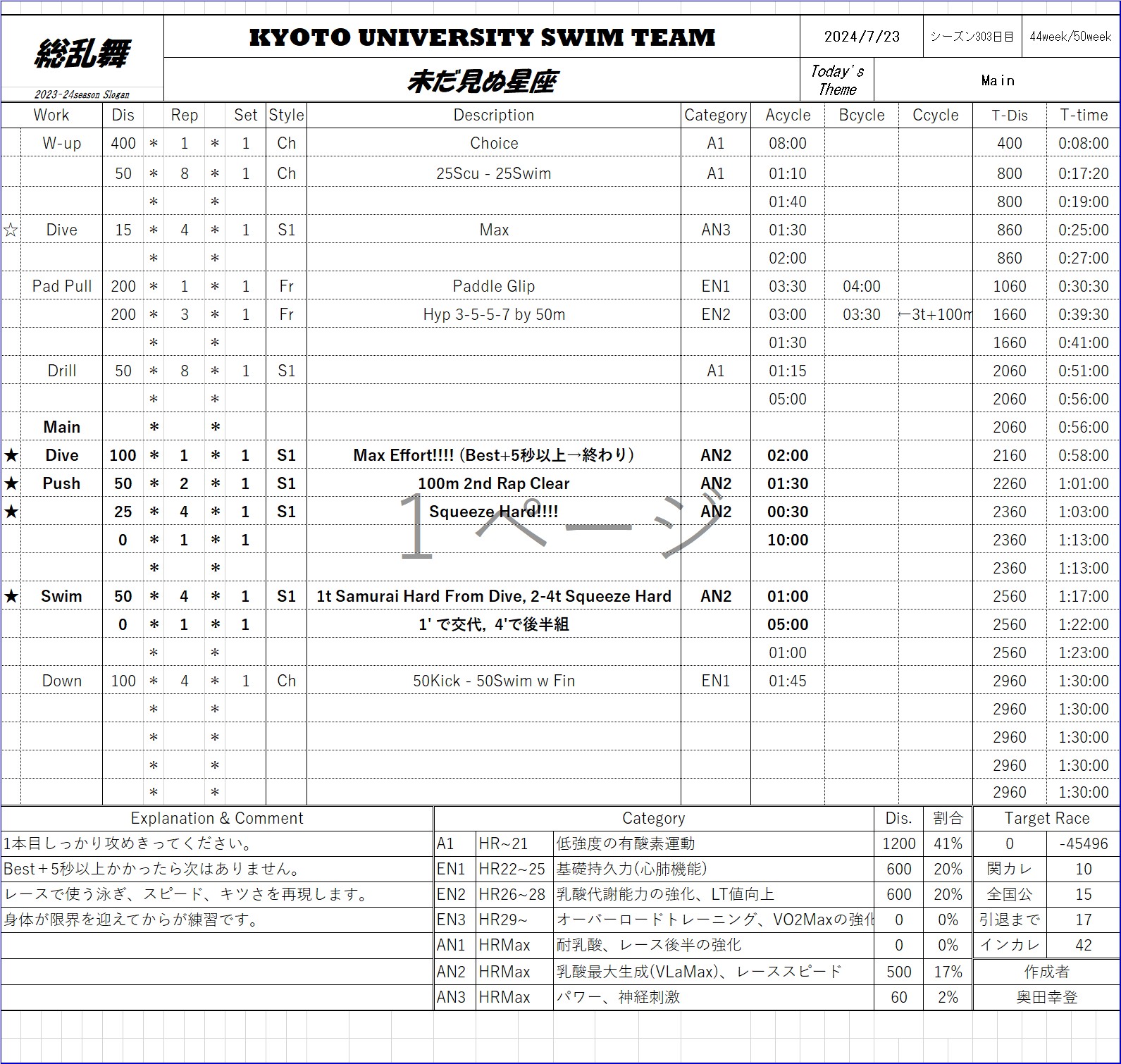 練習タイムだけでいえば去年より遅いですが、水泳の知識はこの一年間で増えたので、プラマイ0くらいになってたら嬉しいです。