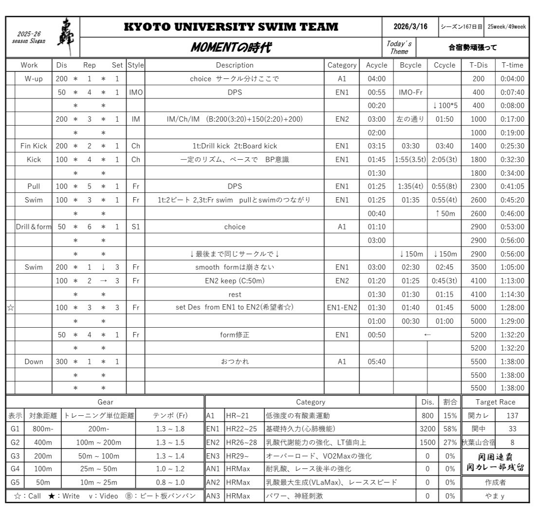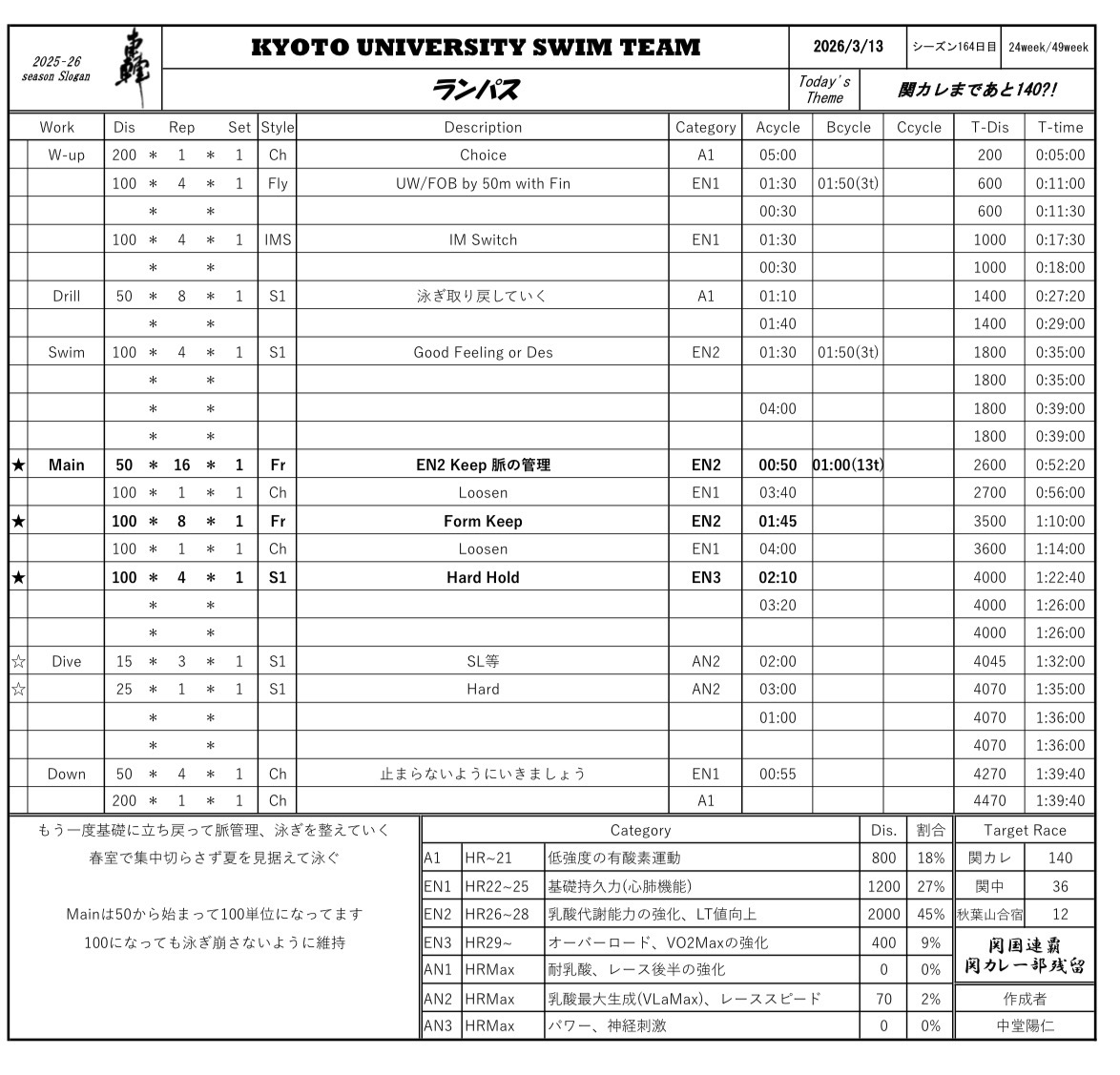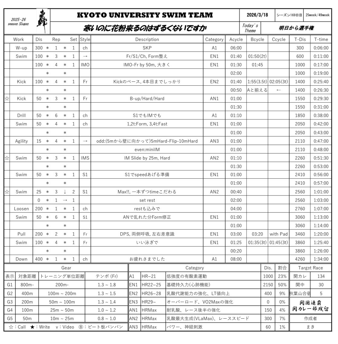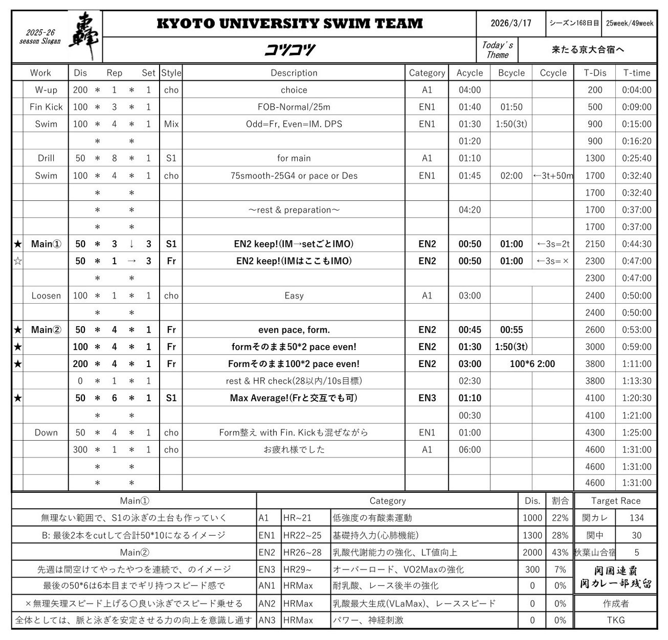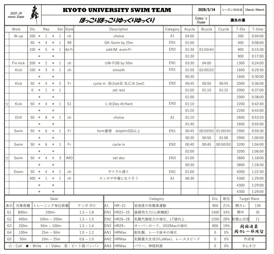 フリーはプルとキックどっちも考えないといけないんできついです。最近は大きくかく、最後までかくことを意識して泳いでいるのでタイムの割にしんどいです。