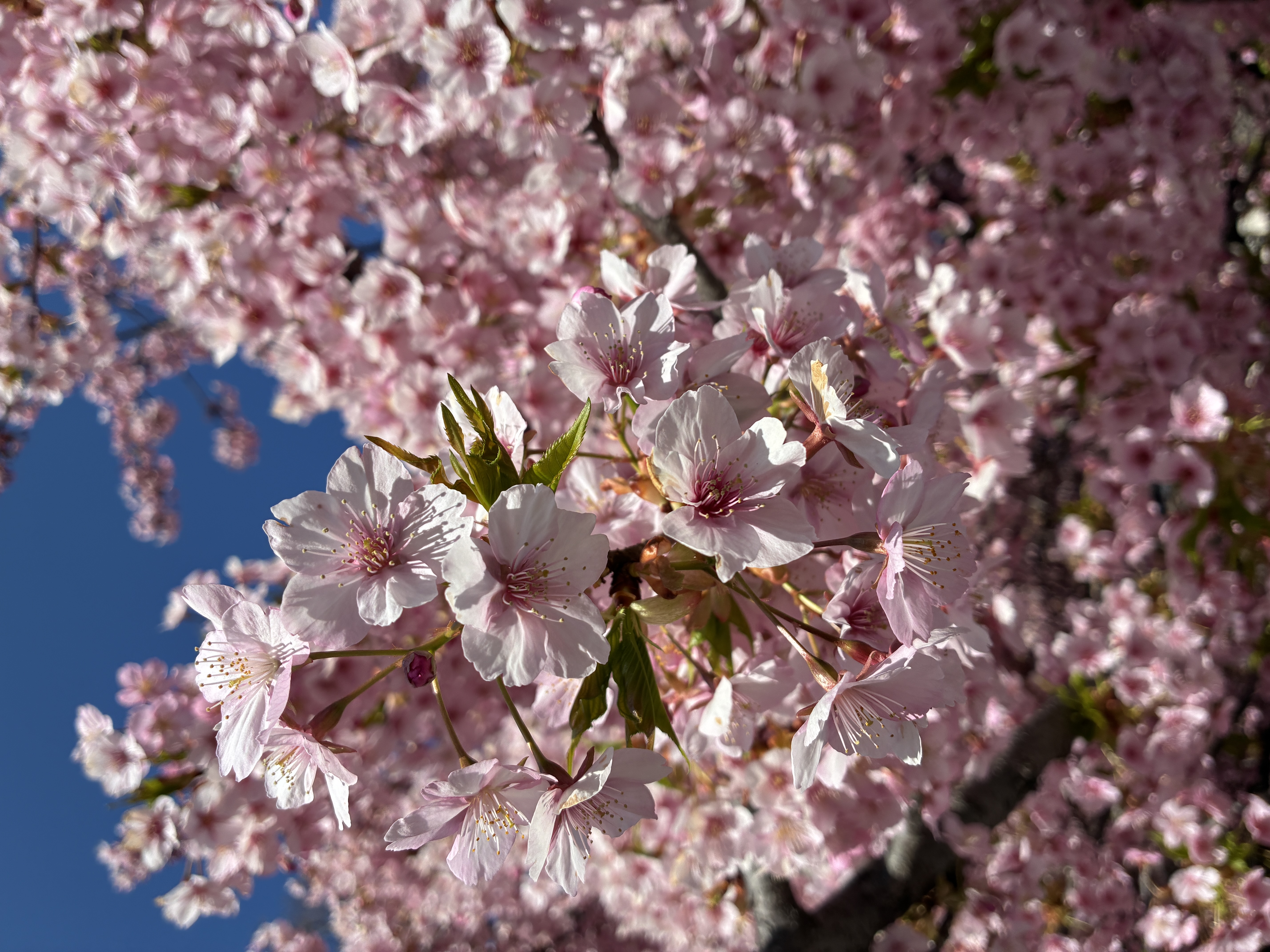その帰りに一条通りを通って帰っていたら、早咲きの河津桜が満開になっていました。めっちゃ綺麗でした。