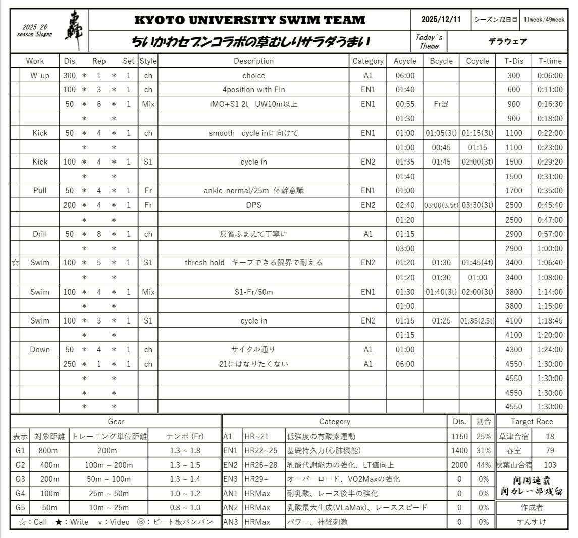 今日ははじめてS1のキックメニューがあったのでブレをしてみました。ブレのキックはある程度速く泳げると思っていたのですが、遅すぎました。Bサイクルも怪しいかも。伸び代だと思って強化していきたいです。メインで泳いだバックもキックがうまく入らなかったので、S1キックの機会があれば練習したいです。