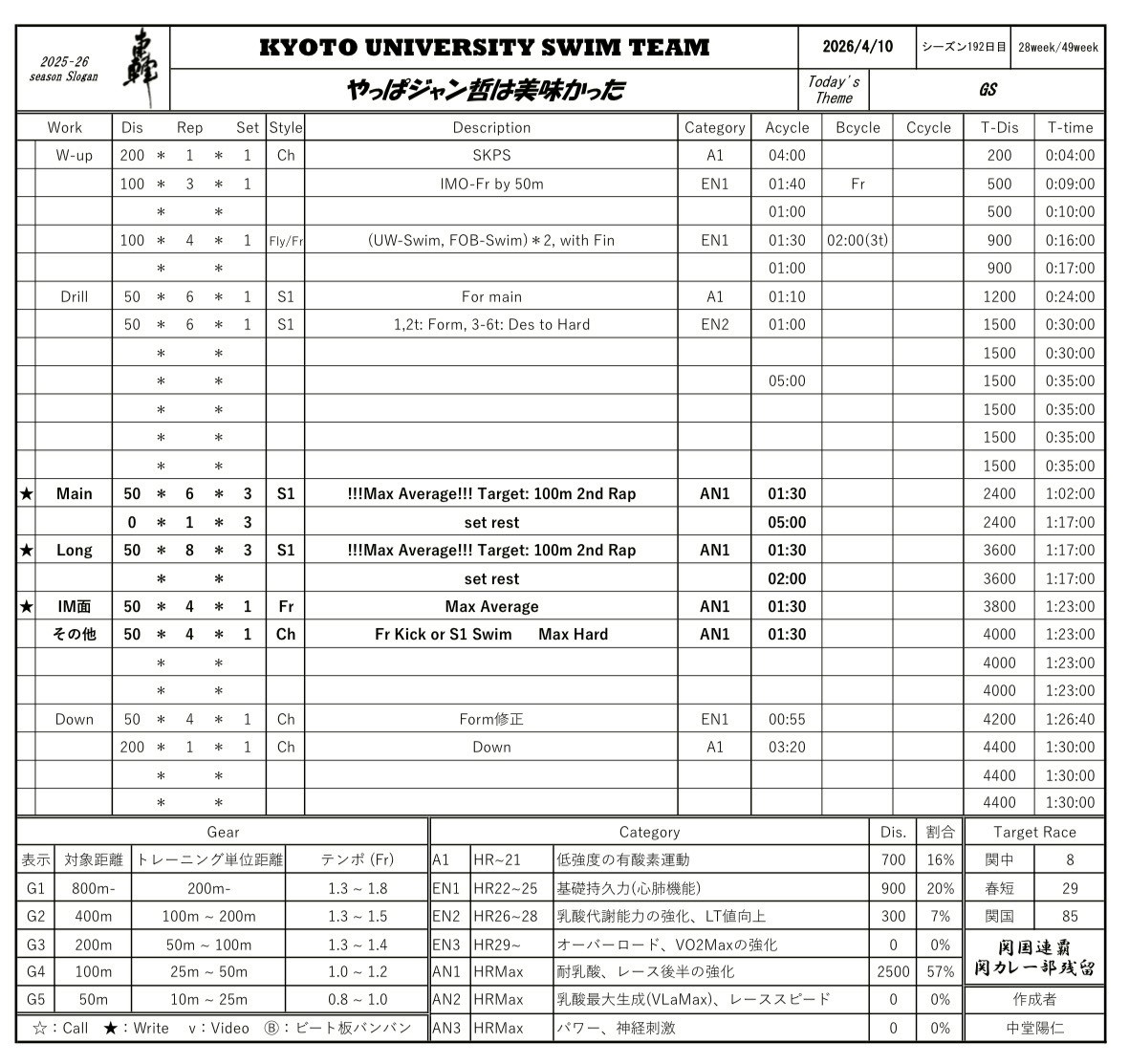 苦しい練習となりました。最近比較的調子は良かったつもりだったんですけど今日はアップの時点でストロークがかからない。腰があまり浮かないって感じで、すぐにばててしまいました。