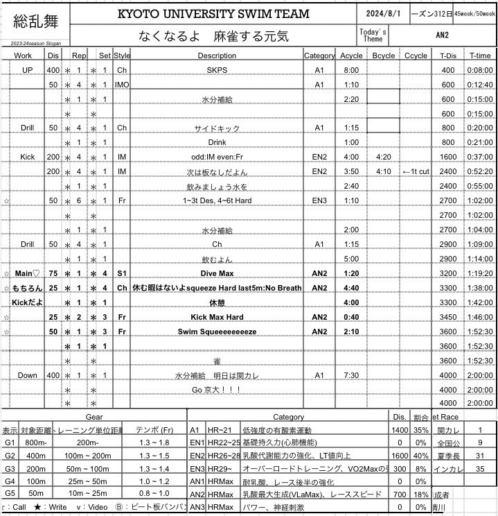 昨日の50×40は良い泳ぎが出来たのですが、今日のメインは50秒サークルだったので各セット2本目以降の泳ぎが乱れてしまいました。